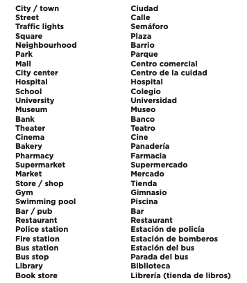 Para formular estas sencillas oraciones es necesario conocer un poco del vocabulario acerca de los lugares de una ciudad, por ejemplo: